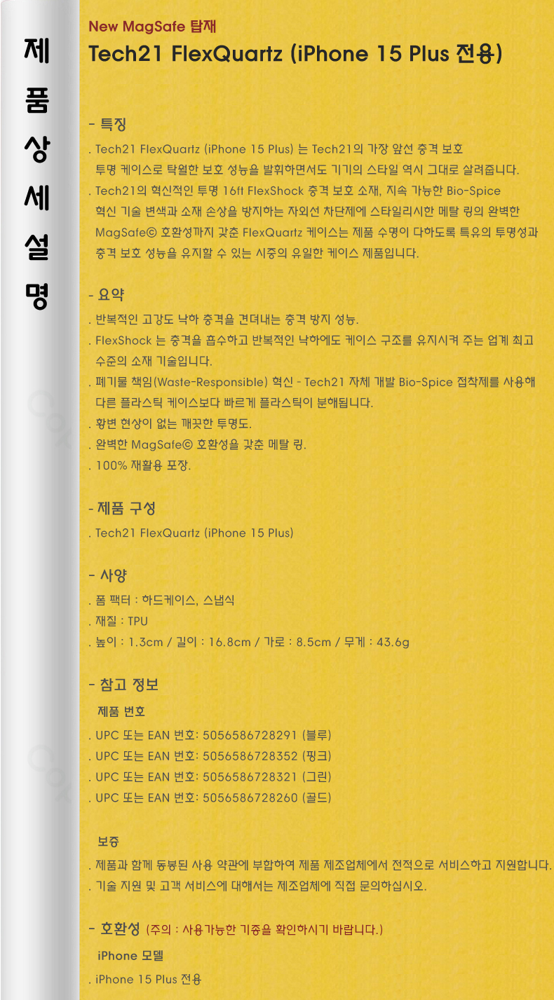 Tech21 FlexQuartz ¸Æ¼¼ÀÌÇÁ žÀç iPhone 15 Plus Àü¿ë (ºí·ç/ÇÎÅ©/±×¸°/°ñµå)