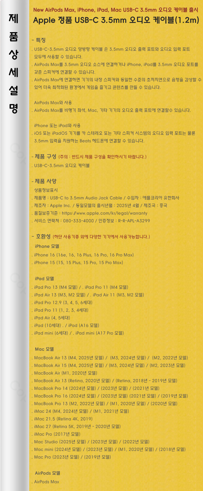 Apple USB-C 3.5mm ¿Àµð¿À È­ÀÌÆ® ÄÉÀ̺í(1.2m)